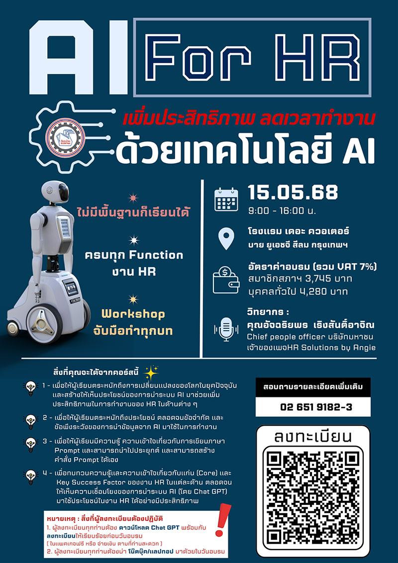 May152025หลักสูตรอบรม สัมมนา AI For HR เพิ่มประสิทธิภาพ ลดเวลาทำงานด้วยเทคโนโลยี AI Category: หลักสูตรอบรม สัมมนาMay 15, 2025Tags: AIHRSeminar Share this post Share on XShare on X Pin itShare on Pinterest Share on FacebookShare on Facebook Share on LinkedInShare on LinkedIn Post navigationPreviousPrevious post:การประชุมใหญ่ ประจำปี 2568 และพิธีรดน้าขอพร ผู้ใหญ่ที่เคารพนับถือ ย้อนหลังวันสงกรานต์NextNext post:เทคนิคการเขียนสัญญาจ้างและข้อบังคับเกี่ยวกับการทำงานMore Articlesเทคนิคการเขียนสัญญาจ้างและข้อบังคับเกี่ยวกับการทำงานMay 15, 2025ไขข้อข้องใจ ทุกประเด็นคำถาม กองทุนสงเคราะห์ลูกจ้าง บังคับใช้ 1 ตค. 2568December 15, 2024